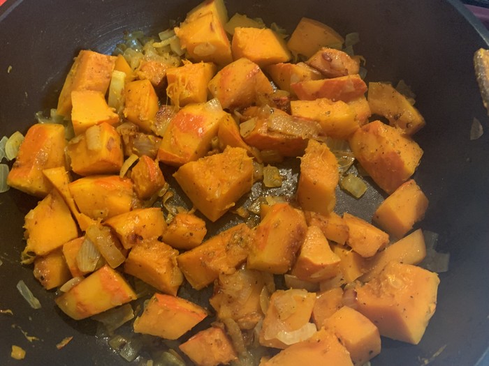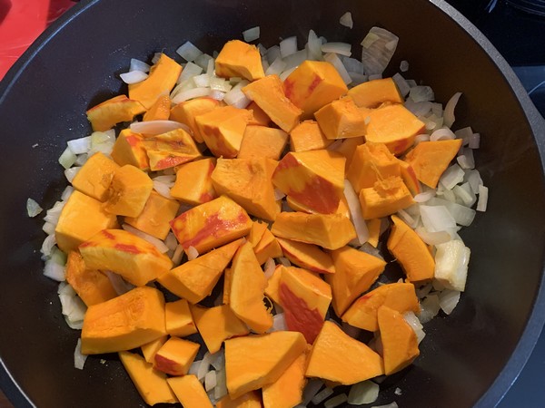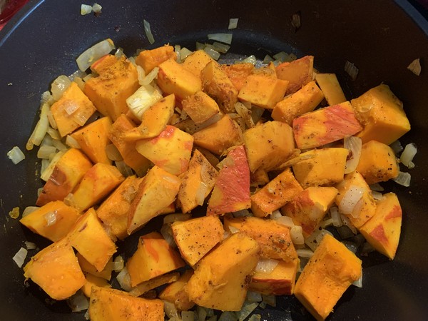 - Ajouter le potimarron, le curry , puis le curcuma et faire revenir le tout pendant 10 minutes tout en remuant