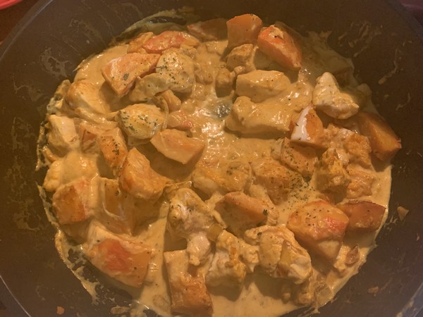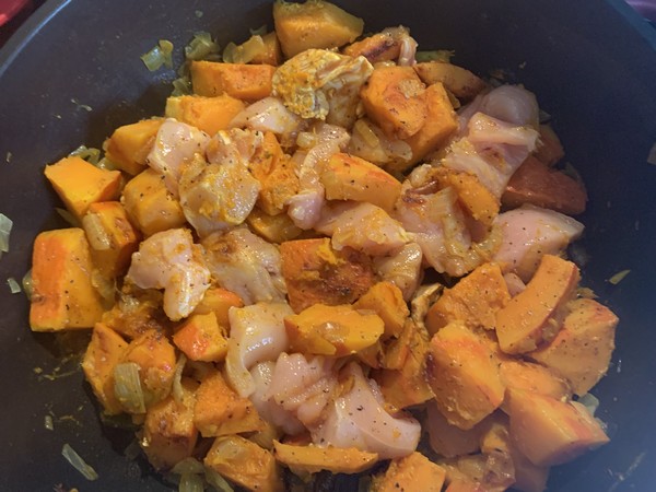- Pendant ce temps couper le poulet en cubes, puis le rajouter dans la poêle en fin de cuisson du potimarron. Assaisonner à votre goût puis poursuivre la cuisson à couvert pour 10 minutes.