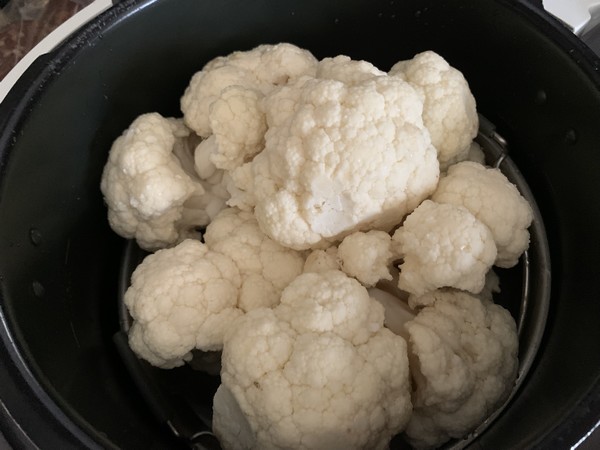- Détailler les bouquets de votre chou-fleur, les laver, (garder le trognon et les feuilles pour une soupe anti-gaspi), faire cuire votre chou-fleur à la vapeur. J’ai utilisé mon Cookéo, mettre les bouquets dans le panier cuisson, puis verser 200 ml d’eau dans la cuve et passer en mode sous pression pour 8 minutes.