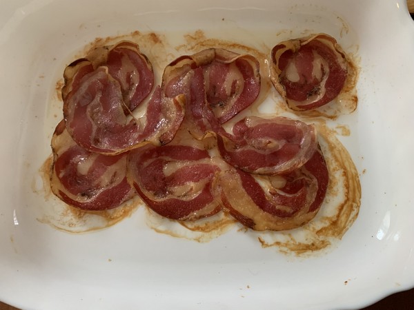 - Placer les tranches de pancetta dans un grand plat à gratin, puis les faire griller à 210° pendant 10 minutes environ, c’est à surveiller, puis les égoutter sur du sopalin. Inutile de nettoyer votre plat à gratin, vous l’utiliserez pour la suite.