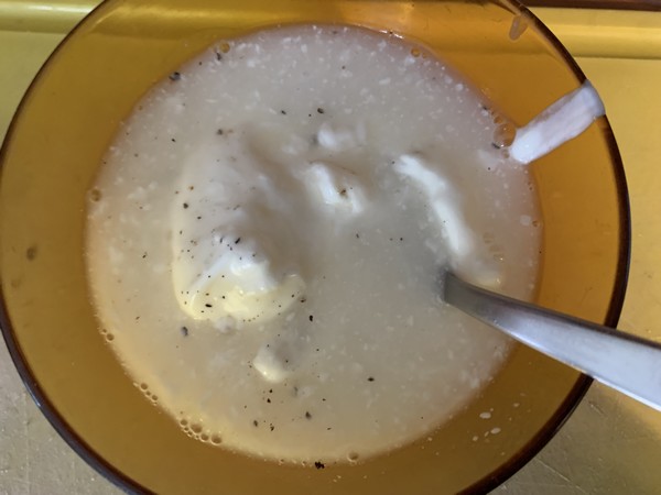 - Mélanger la crème fraîche avec l’eau de cuisson des pâtes, poivrer, puis verser ce liquide sur le mélange pâtes/chou-fleur/cheddar.