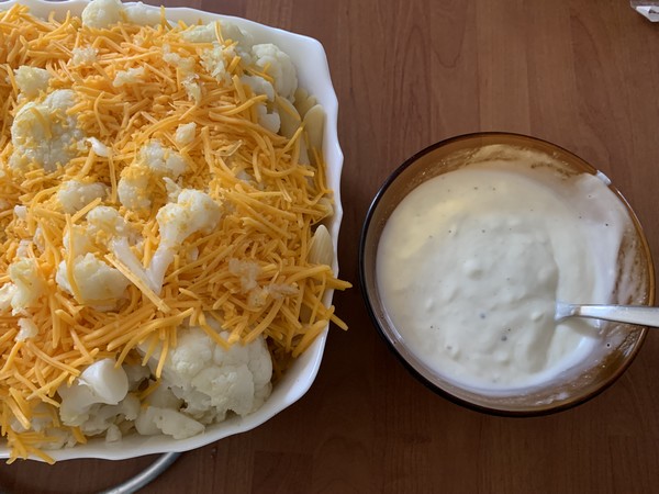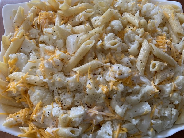 - Déposer dans le plat à gratin les pâtes, et les bouquets de chou-fleur, écraser et parsemer l’ail sur le dessus des pâtes, saupoudrer le cheddar et mélanger le tout.