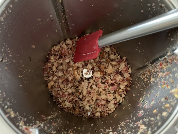 - Mettre la pancetta grillée et égouttée dans le bol du Thermomix avec le romarin, du poivre et le pain coupé en morceaux, mixer 30sec/vit5 puis 15 sec/vit6.