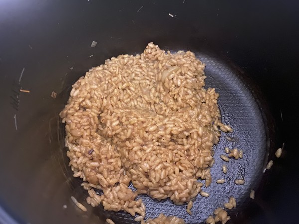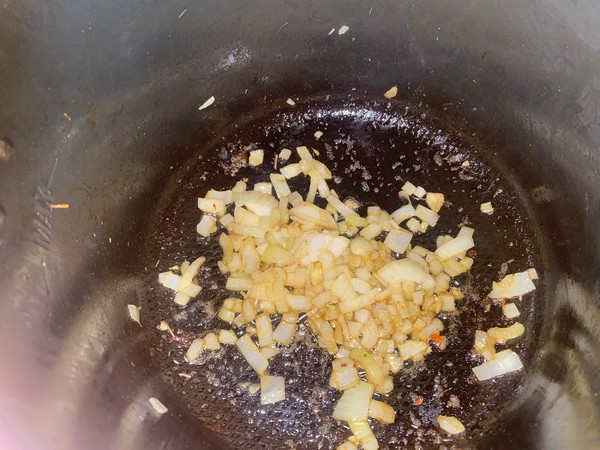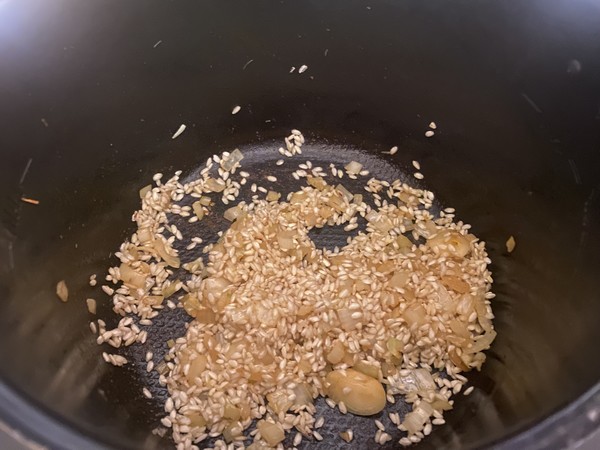 - Ajouter le reste d’huile dans la cuve, en mode dorer faire revenir l’oignon épluché et émincé pendant 1 minute puis ajouter le riz et laisser dorer 3 minutes en remuant.