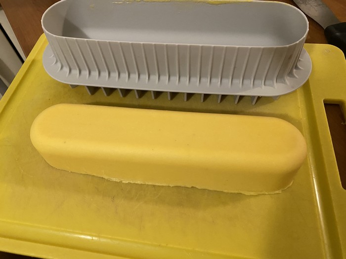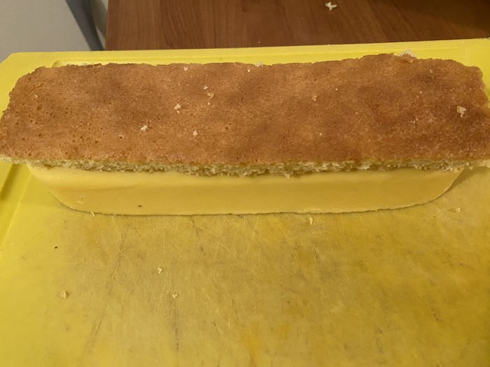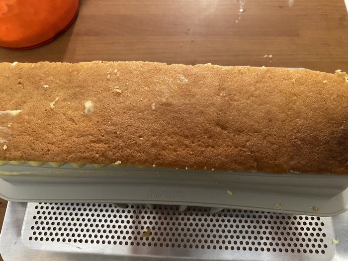 2. Couper votre biscuits madeleine à la dimension du moule, et une autre bande à la dimension du crémeux passion