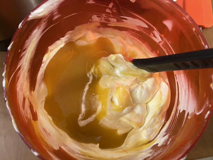 3. Monter la crème liquide en crème fouettée ( j’utilise mon speedy chef) puis incorporez là dans le mélange précédent une fois refroidie.