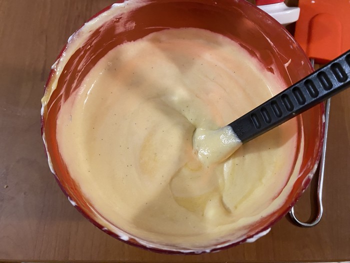 5. Une fois votre préparation lisse et homogène verser et lisser la préparation sur une toile à génoise beurrée et cuire pendant 13 minutes.