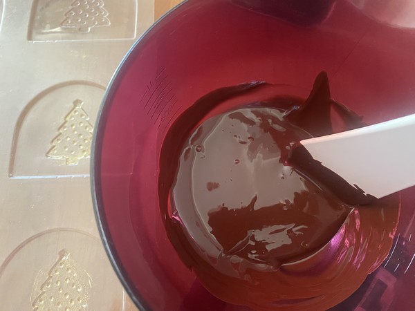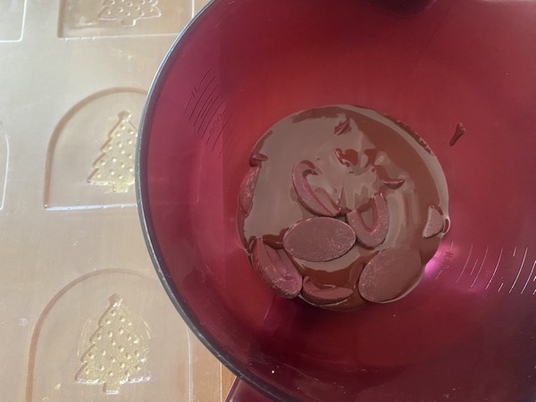 2. Dès que la fonte du chocolat est bien avancée mais qu’il reste encore quelques pistoles entières retirer le récipient du bain-marie. À ce moment là le chocolat est  à 40°C environ. Ne jamais aller au delà de 45°C.