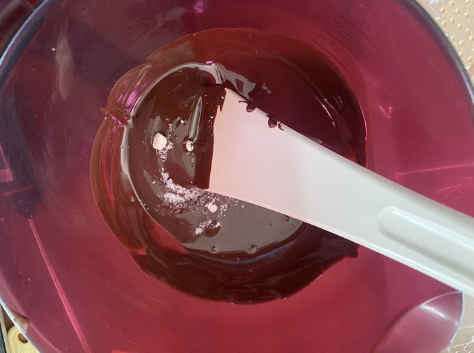 3. Le chocolat déjà fondu suffira à faire fondre le restant de chocolat sans avoir recours à une quelconque source de chaleur. Ainsi l’ensemble devrait chuter à une température de 34/35°C.