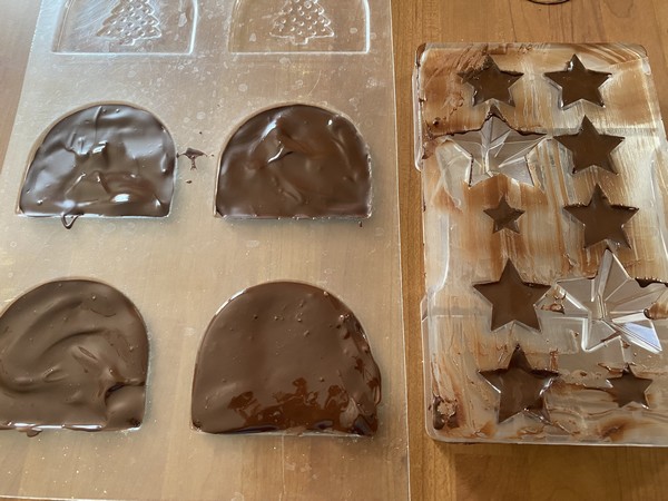 10. Lisser avec une petite spatule métallique coudée, de façon à égaliser tout le chocolat, de sorte qu’il arrive au bord des empreintes.
