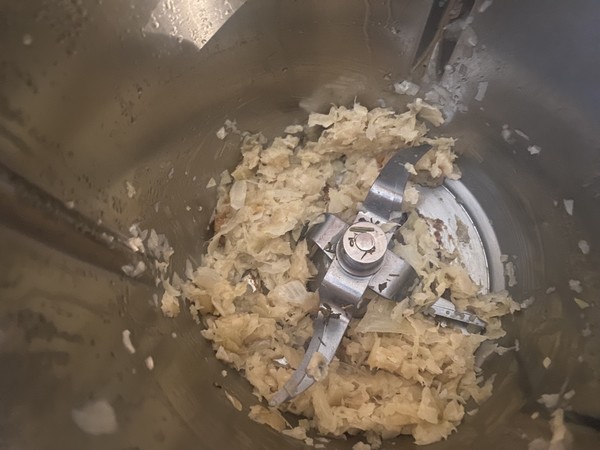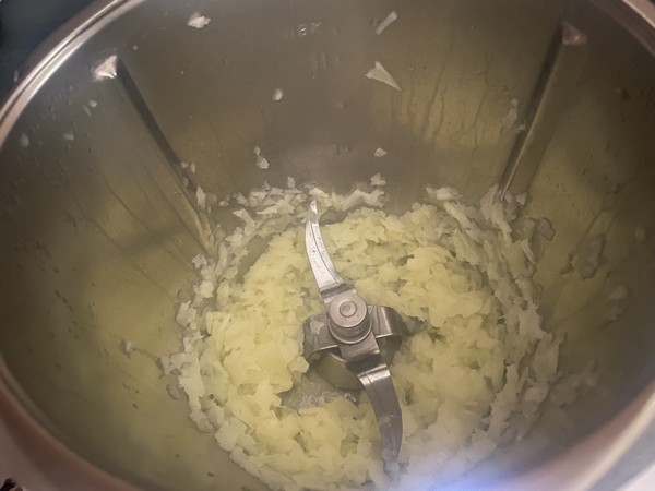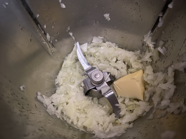 - Eplucher et couper l’oignon en 4 puis le mettre dans le bol et mixer 5sec/vit 5 racler les bords et déposer le beurre puis faire revenir 4 min/Varoma/Vit 1 sans le gobelet.