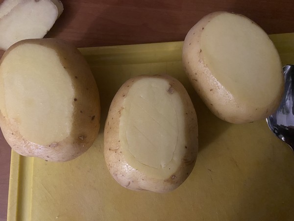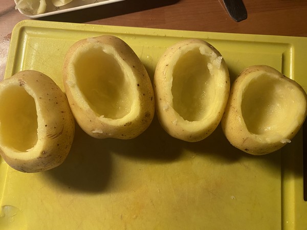 - Laver et frotter vigoureusement les pommes de terre, couper le haut des pommes de terre, et les creuser en forme de barquettes. J’ai utiliser la chair des pommes de terre dans une soupe.