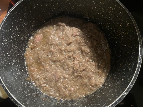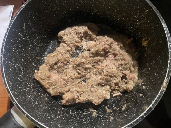 - Dans une casserole, faire chauffer les rillettes à feu doux. Lorsque la graisse a fondu, retirer la moitié de la graisse en pressant la chair de la rillette.