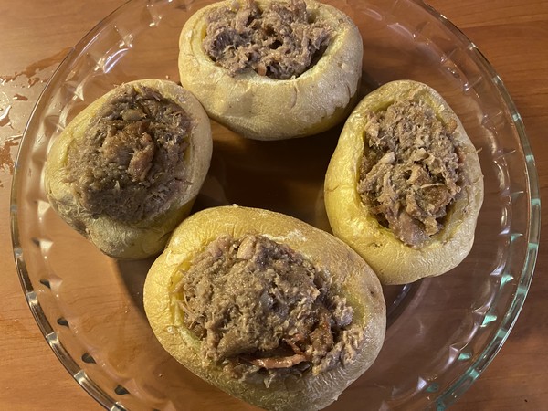 - Remplir le fond des pommes de terre creusée avec la compotée d’oignons jusqu’à mi-hauteur. et recouvrir avec des rillettes dégraissés pour former un petit dôme.