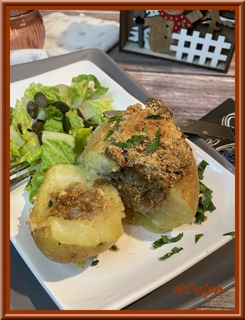 des pommes de terre farcies bien appétissantes avec cette garniture, bonne journée