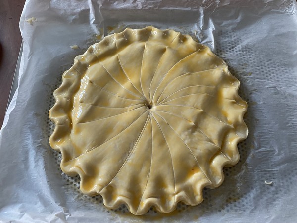 - Badigeonner l’ensemble de jaune d’œuf faire des dessins et un trou au milieu de la galette pour que la vapeur puisse s’évacuer.