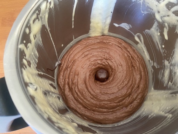 - Verser le chocolat fondu dans la préparation et mélanger jusqu’à obtenir une pâte homogène.