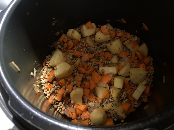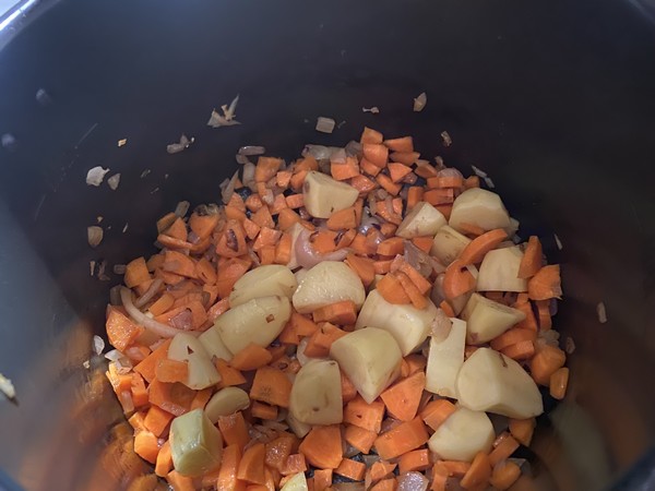 - Mettre le Cookéo en mode dorer, y verser l’huile puis faire revenir l’oignon 1 minute en mélangeant régulièrement, incorporer les pommes de terre et les carottes puis laisser dorer 1 minute en mélangeant, saler et poivrer.
