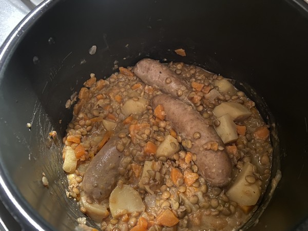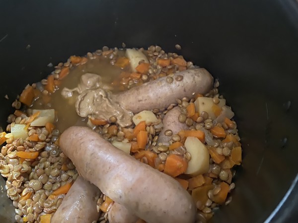 - Ajouter les lentilles rincées à l’eau, les saucisses piquées et le bouillon mettre en mode sous pression pour 10 minutes.
