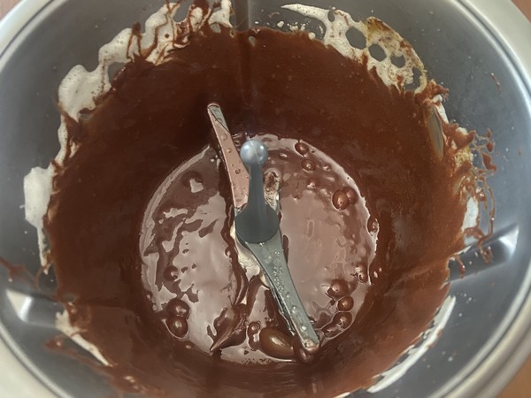 - Ajouter le caramel beurre salé tiédi, le chocolat fondu et la farine puis mélanger 40sec/vit3.