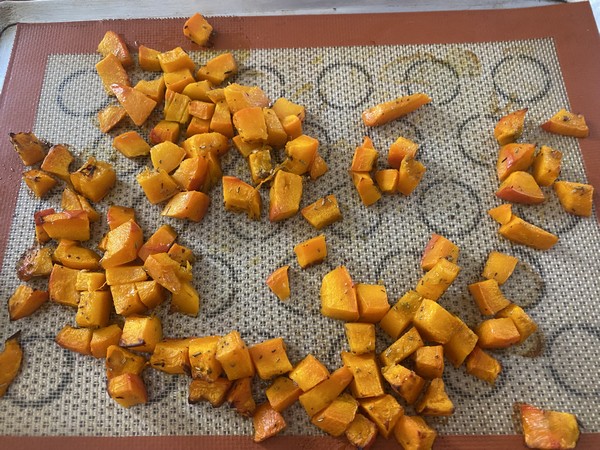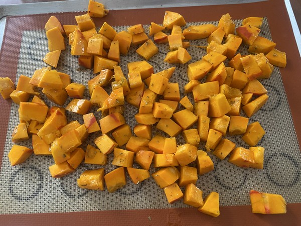 - Peler le potiron, le couper en cubes. Dans un plat, mélanger les cubes de potiron avec 2 cuillères à soupe d’huile , le sirop d’agave, du sel, du poivre et le thym. Les étaler sur une toile silpat, puis les faire rôtir pendant 20 minutes à 210ºC.