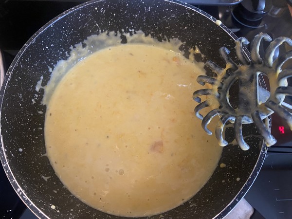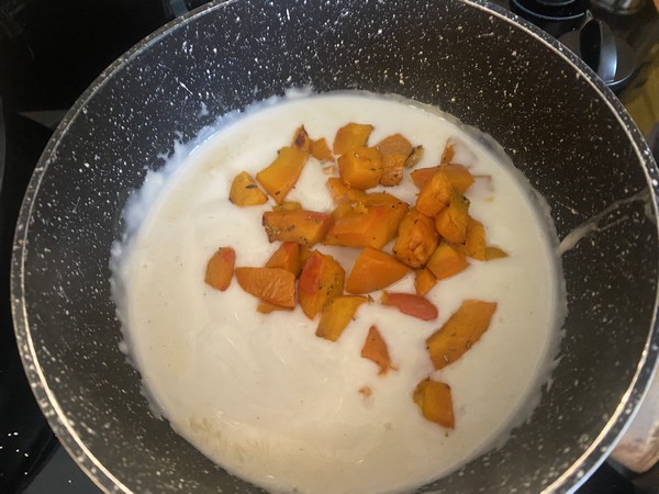 - Ne garder que 40 cl environ de la béchamel, garder le reste pour un futur gratin, dans les 40 cl de béchamel mettre la moitié du potimarron rôti et l’écraser, vous obtiendrez la sauce béchamel au potimarron.