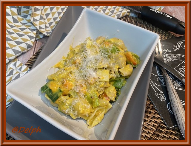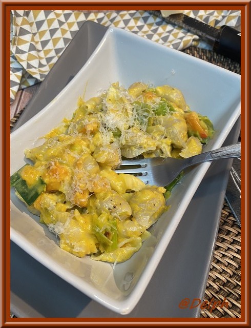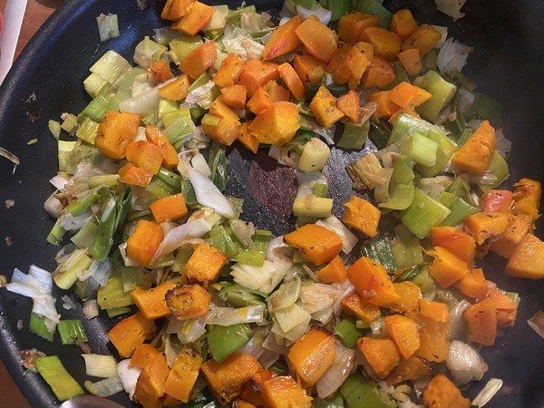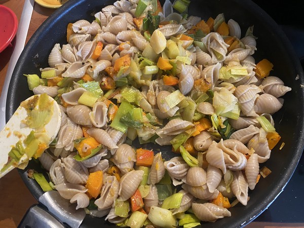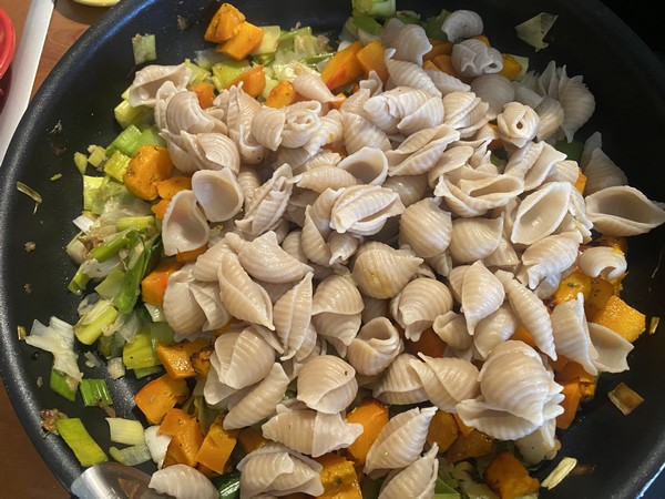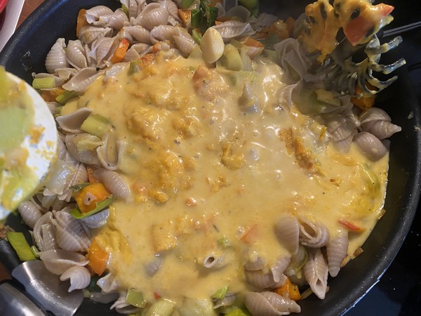 - Ajouter les pâtes égouttées dans le wok avec les poireaux, le reste du potimarron rôti, mélanger puis verser la sauce béchamel, puis mélanger le tout.