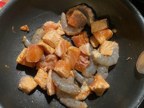 - Faire saisir 2 minutes les pavés de saumon découpés en gros cubes dans votre Wok avec les gambas, le curry et l’huile .