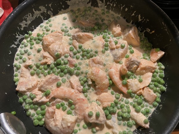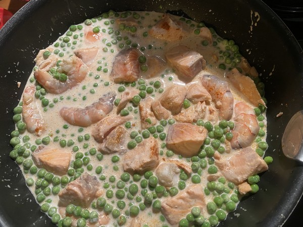 - Ajouter les petits pois et lait de coco, saler, poivrer, puis laisser cuire 20 à 25 minutes à feu doux, couvrir, mélanger délicatement de temps en temps.