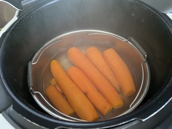 - Faire cuire les carottes à la vapeur pendant une quinzaine de minutes, j’ai utilisé mon Cookéo 15 minutes en mode sous pression.