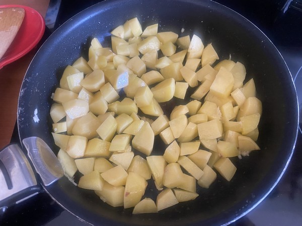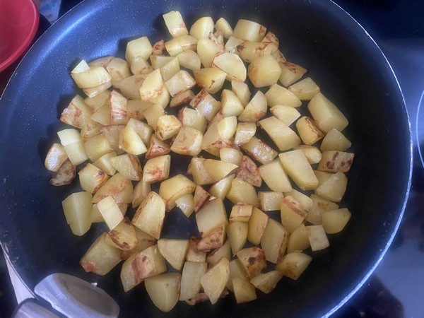 - Dans votre poêle, mettre l’huile et le beurre, laisser chauffer sur feu moyen puis ajouter l’ail haché, remuer environ 1 minute, ajouter les pommes de terre en dés, mélanger régulièrement et laisser cuire sur feu moyen environ 15 minutes.