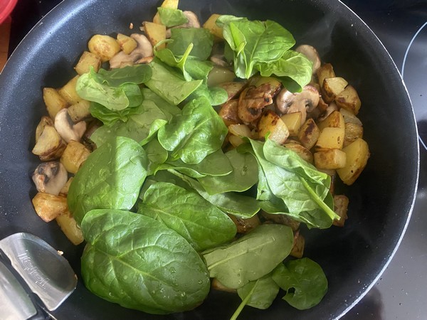 - Eplucher dégermer la gousse d’ail. Eplucher, laver et couper les pommes de terre en petits cubes. Nettoyer les champignons et les couper en lamelles. Nettoyer les épinards et enlever les plus grosses côtes.