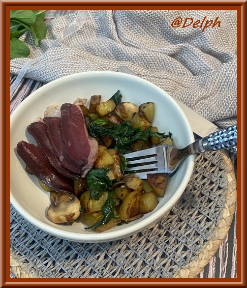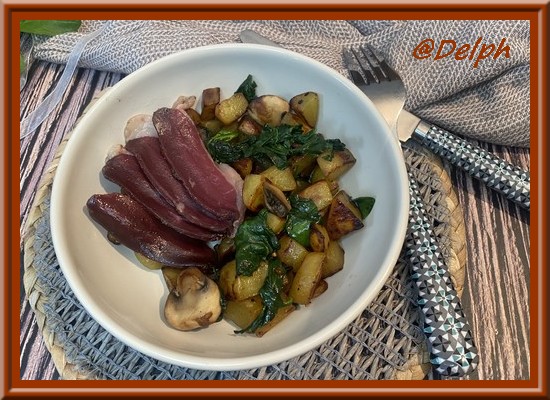- Dresser vos assiettes et déposer quelques tranches de magret de canard séchée.