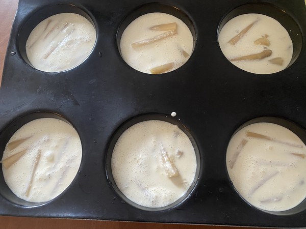 - Tailler les asperges précuites en tronçons d’environ 2 cm. Les répartir dans des ramequins individuels préalablement graissés, puis verser dessus l’appareil à clafoutis.