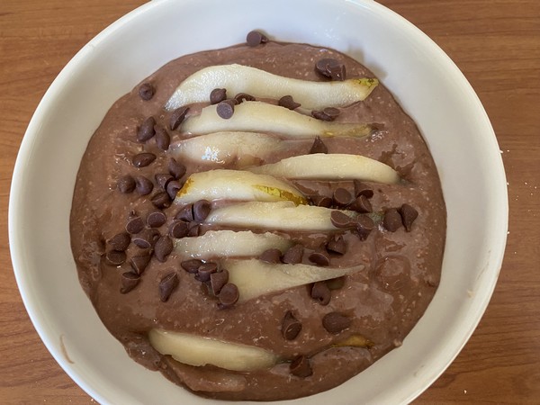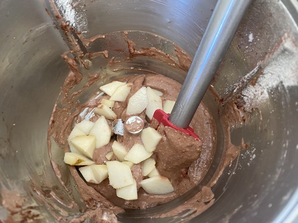 - Éplucher et couper la moitié de la poire en morceaux et l’ajouter à la pâte en mélangeant avec la spatule.
