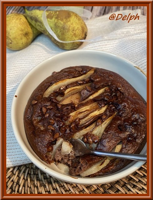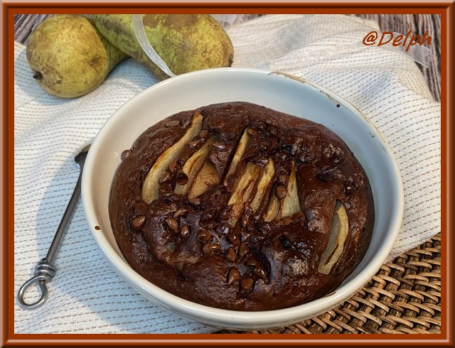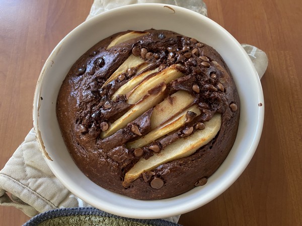 - Enfoncer l’autre moitié de la poire coupée en lamelles dans la pâte et parsemer de pépites de chocolat.