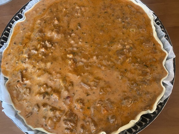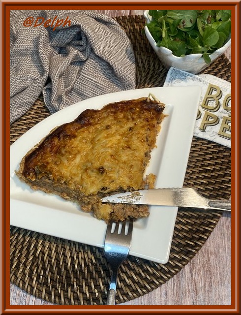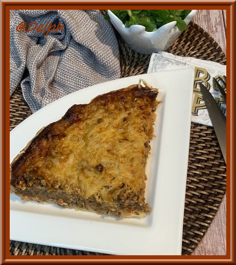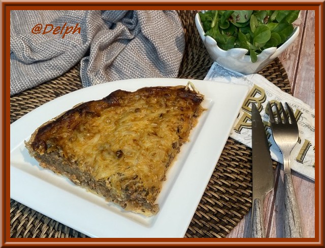 Voici une nouvelle tarte bien généreuse et gourmande, elle est faite pour ceux qui aiment la viande. Je vous conseille de la proposer avec une bonne salade verte, pour avoir un peu de vert dans votre assiette. Vous pouvez la réaliser en avance et la faire réchauffer à 160° pendant 20 minutes pour la déguster.