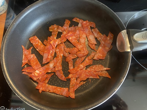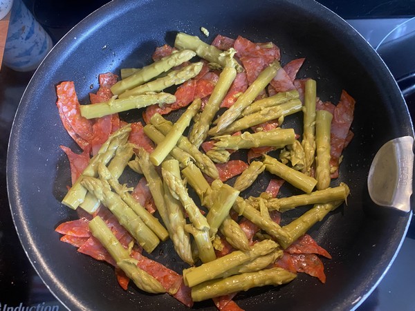 - Détailler le chorizo en lamelle, puis dans une poêle au revêtement anti adhésif, le faire chauffer sur feu moyen, ajouter les pointes d’asperges, laisser chauffer environ 5 minutes.