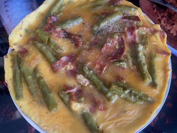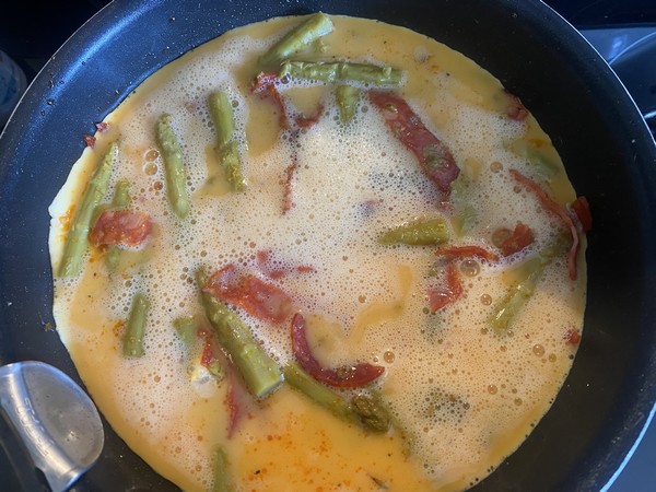 - Verser les œufs fouettés sur le chorizo et les asperges, laisser cuire l’omelette quelques minutes jusqu’à ce qu’elle soit prise.