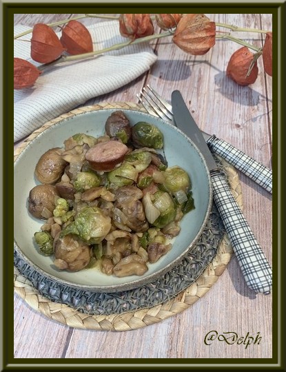 Choux de Bruxelles et châtaignes à la saucisse de Montbéliard