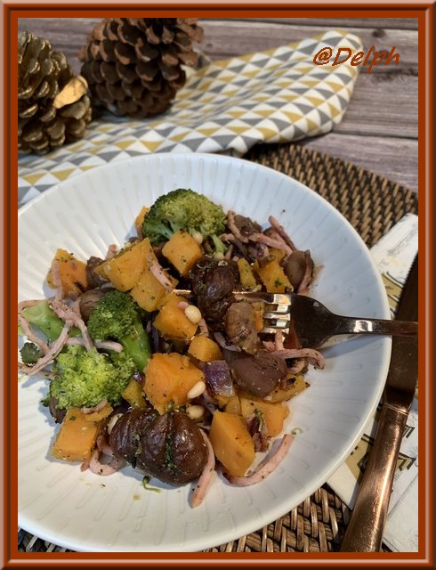 Poêlée de brocolis, patate douce, marrons et jambon fumé