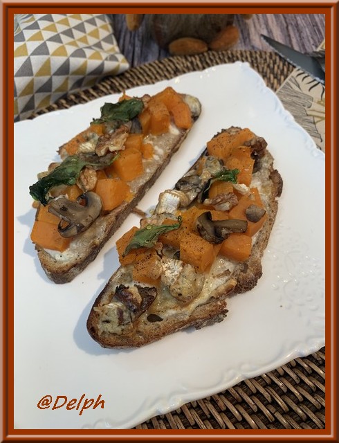 Des petites tartines que j'aime bien préparer, j'en fais régulièrement avec différents ingrédients. J'avais un bon pain de campagne alors j'en ai profité pour me faire plaisir. Ingrédients : Pour 4 petites tartines 4 tranches de pain complet de campagne 1 petite patate douce 50 de champignons bruns 2 tranches de Bresse Bleu Quelques cerneaux... Lire la Suite →