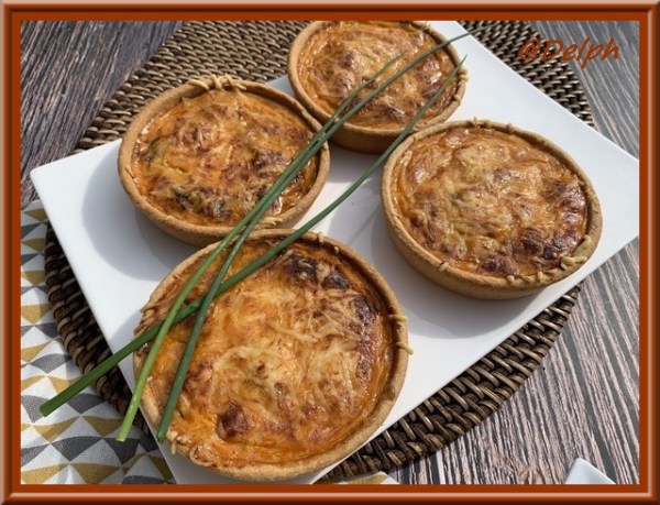 Voici de délicieuses quiches que vous pourrez proposer en entrée avec une bonne salade verte. L'ensemble des ingrédients se marient à merveille.  J’ai utilisé mes fonds de quiche de prêt à garnir, c’est bien pratique, vous pourrez utiliser une pâte feuilletée ou brisée à la place. Ingrédients : Pour 6 quiches à bord bas 6 quiches... Lire la Suite →