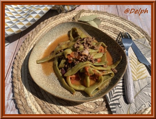 Haricots plats et tomates au bœuf haché