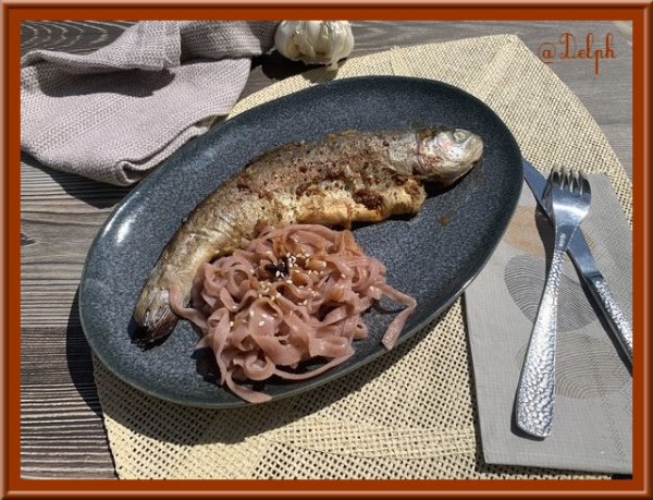J'aime beaucoup ce poisson, et cuisiné au four je trouve que la cuisson est parfaite. J'aime beaucoup les saveurs d'Asie je me suis donc régalée avec cette marinade. J'ai accompagné ma truite de tagliatelles thaïes de riz rouge. Un repas tout simple mais bien bon. Ingrédients : Pour 1 personne 1 truite vidée et écaillée... Lire la Suite →
