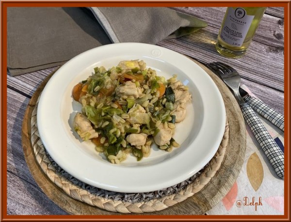 Aiguillettes de poulet aux poireaux, carottes et blé