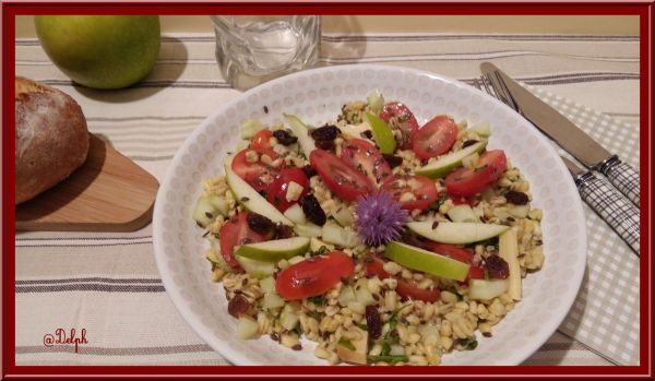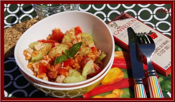 Voici une salade végétarienne que je vous propose, j'aime beaucoup ce petit côté sucrée salée. C'est très agréable à déguster, c'est frais et léger. Ingrédients : Pour 2 personnes 130 g de blé250 g d'eau1 bouillon cube légumes Méditerranéensquelques feuilles de persil1 gousse d'ail1/2 concombre10 tomates cerises allongées2 tranches fines de pommes Granny SmithComté1 poignée... Lire la Suite →