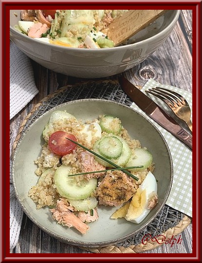 Une nouvelle salade avec du boulghour, cela change et c'est bon. Elle est fraîche et légère un vrai régal. Ingrédients : Pour 3 personnes 3 œufs durs 100 g de boulgour 5 tomates cerises 250 g de filet de saumon quelques dés de féta à l'huile 4 c à s de vinaigre de cidre 2 c... Lire la Suite →