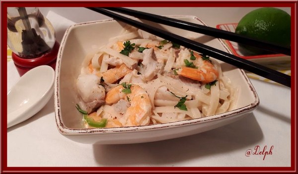Tagliatelles de riz pimentées aux crevettes et lieu noir