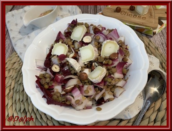 Voici une délicieuse salade avec les dernières endives que l'on trouve sur nos étals. J'ai utilisé une endive rouge, la carmine, car j'aime beaucoup le rendu dans l'assiette. Ingrédients : 150 g de lentilles blondes 1 oignon rouge 1 endive rouge 1/2 crottin de fromage de chèvre Quelques noisettes Pour la sauce : 2 c... Lire la Suite →